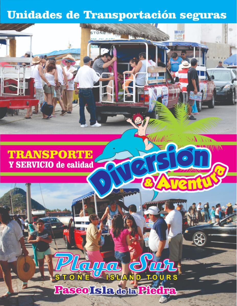 Descripción: Inolvidable paseo por la bahía de aproximadamente 1 hr donde los llevan a conocer el faro, cueva de la garganta, santuario de aves y la piedra de los lobos marinos. Posteriormente desembarcan en la isla de la piedra donde duran 3 hrs en las mejores playas de Mazatlán en un restaurante con todos los servicios.